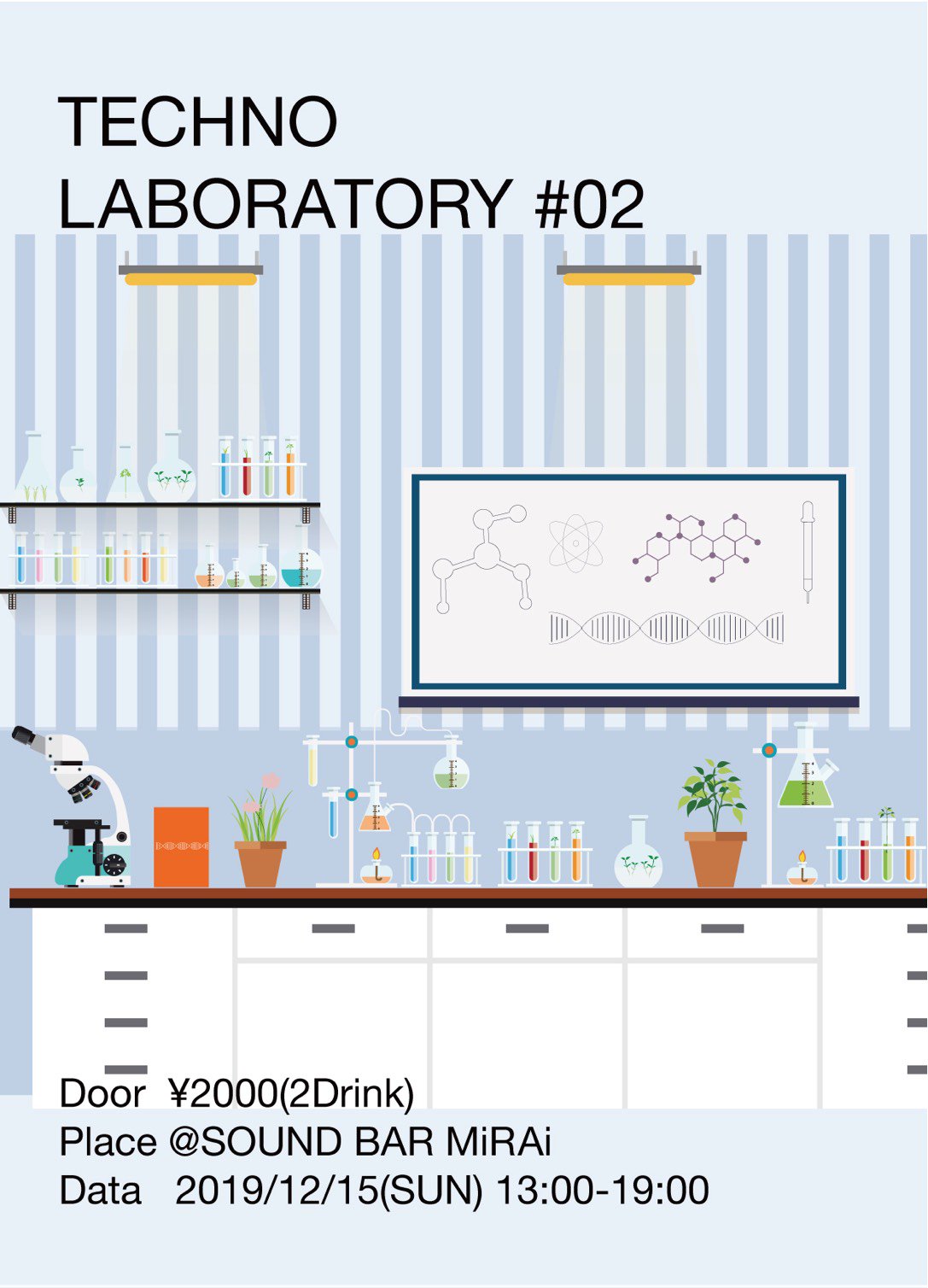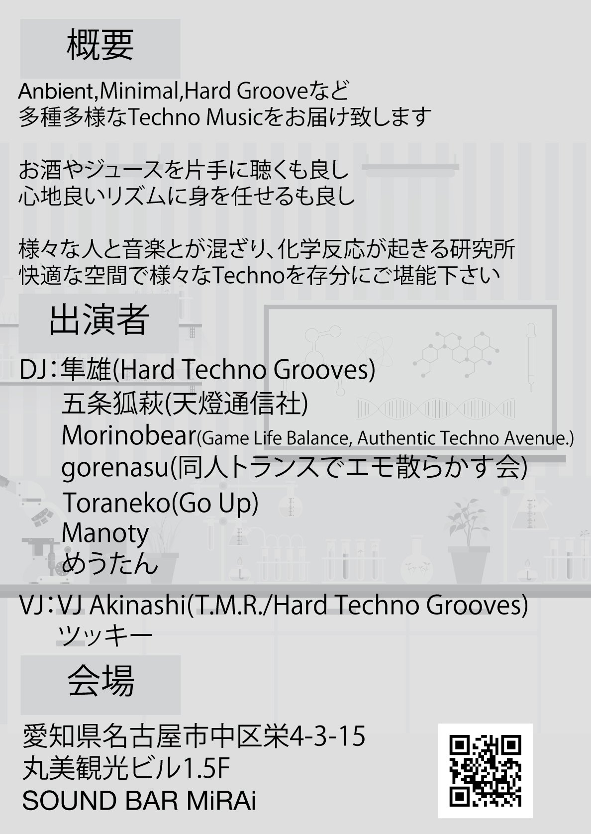 Hard Techno Groovesはかなりカッチリしたコンセプトの下で運営しており、やや敷居が高いという声があったため、いろんな人がふらっと遊びに来れるようなゆったりとした空間づくりをコンセプトにTechno Laboratoryを開催致しました。