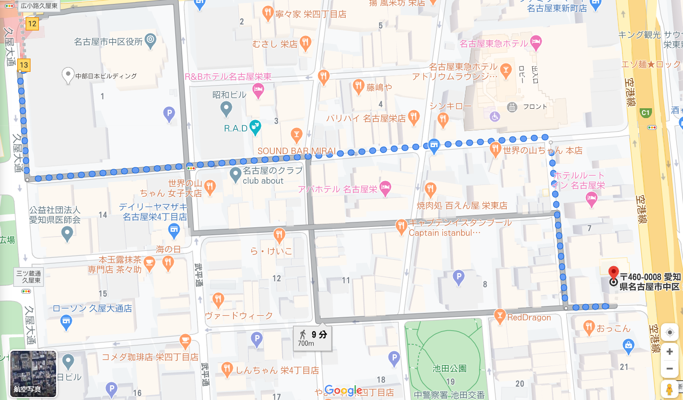 栄駅12,13番出口から地図通りに向かうか、東に行って名古屋高速の下の道を南に進むと辿り着きます。